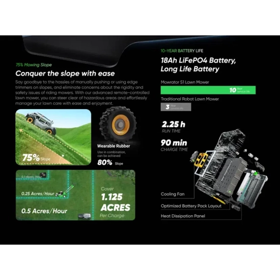 Som profesjonell bruker av produkter til grøntvedlikehold vet du at ikke alle plener er enkle å klippe. Skråninger, ujevnt terreng og tett, vått gress kan være en utfordring for vanlige klippere. Mowrator S1 Advanced er konstruert for å håndtere selv de mest krevende oppgavene – raskt, effektivt og med minimalt vedlikehold.