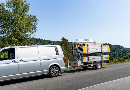 Tysse stillashenger gjør transport av stillas på tilhenger enkelt og trygt. Stillashengeren kan lett utvides ved å montere flere armer, og det er en egen kasse for stillasføtter fremme på draget. Se vår stillashenger her.